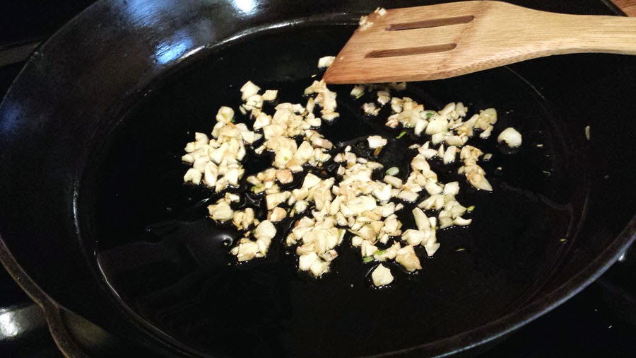 Meanwhile, dice up your garlic and sauté it in the Olive oil on low heat. You want it translucent and soft. Careful not to burn it. Remove your pan from the heat and set aside.