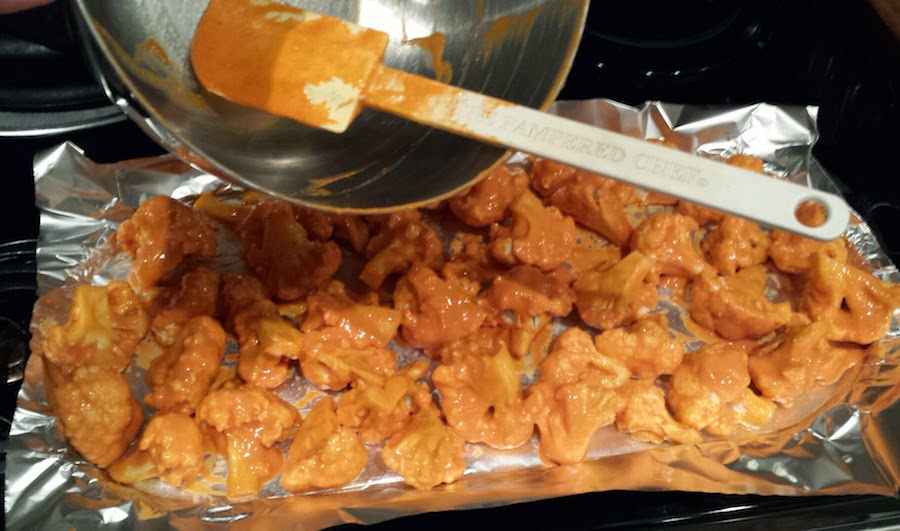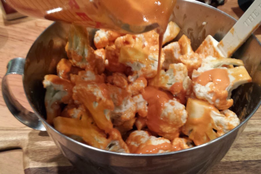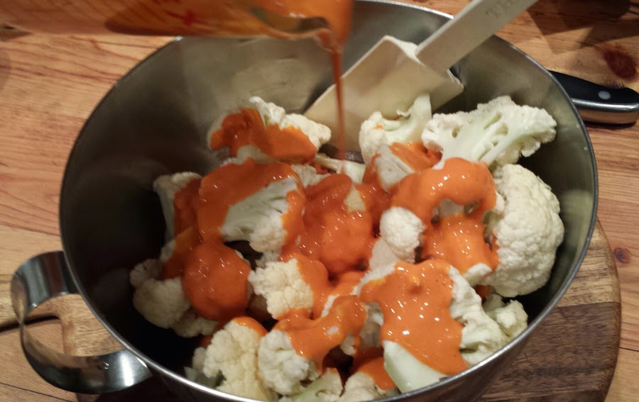 Slowly pour a third over your Cauliflower. Mix it up, pour another third, mix and pour the last. You'll want to do this because there's lots of crevices in the Cauliflower and you want the sauce to cover and coat as much as you can.