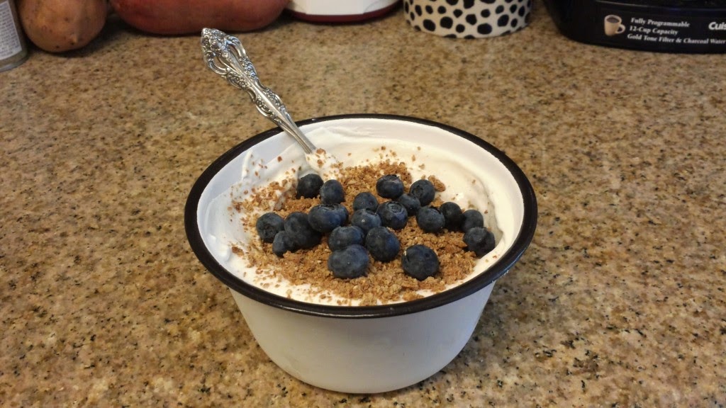 Begin by dumping the vanilla protein scoop into a medium sized bowl. Smother the helpless whey powder in two scoops of Greek Yogurt and begin mixing them together (slowly at first!) with a spoon. As you continue mixing the two ingredients will bind together and you’ll be able to speed up as the process goes along. Remember to scoop the spoon along the bottom of the bowl to mix the powder and yogurt together; you don’t want a mouthful of chalk when you take your first bite! Once the two are mixed sprinkle the 1/4 cup of cereal and throw a handful of blueberries on top to seal the deal. There you go: it’s Protein Yogurt time!